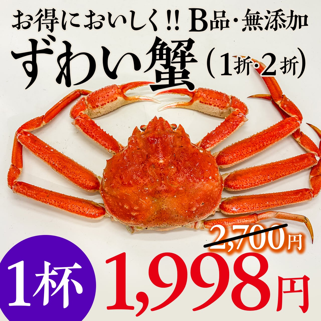 正規品1杯5,000円のずわいがにが、B品(1折れ・2折れ)につき50%OFFの2,500円(税別)!